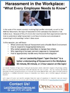 Open Door Training & Development offers expert training, seminars, books and other educational resources including dementia care for caregivers, Alzheimer's care, and business leadership training for long-term care facilities and other business located in the Harrisburg, Pennsylvania area including; Lancaster, Millersville, Manheim, Chambersburg, York, Limerick, Bethlehem, and Pottsville, PA.